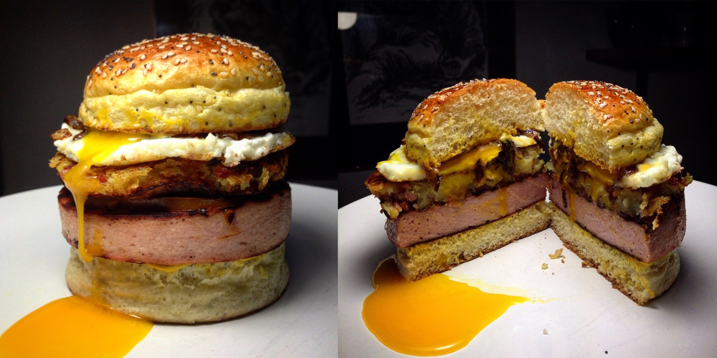 The intense flavors of Fleischkäse and hash browns, the contrast of the runny yolk of the egg, the texture of tomato, bitter taste of crispy fried onion and spicy and the sweet honey mustard and horseradish, all fit in a nice artisan bun, required by american tradition, they create a unique flavor explosion!