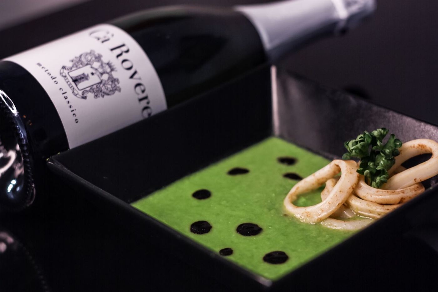 We chose to be combined with this Bubbles of Cà Rovere, a beautiful reality of Vicenza that produces classic method of the highest quality. This Blanc de Blanc obtained with only Chardonnay grapes and 36 month on lees perfect with this delicious appetizer. Its freshness and its acidity blend well with the creaminess of the pea and its fine perlage and persistent go well with the softness of the squid