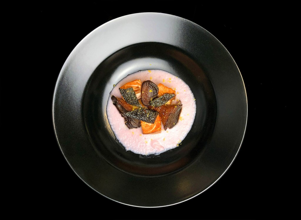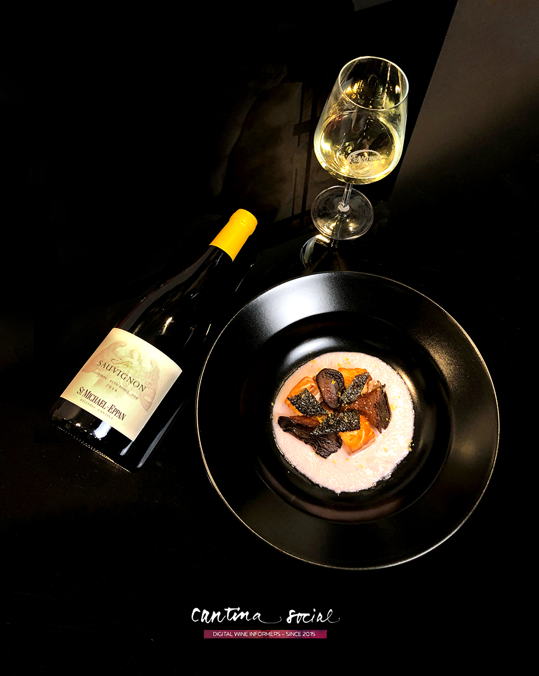 Chiudere gli occhi e fare un boccone vi porterà direttamente tra gli altipiani di San Michele Appiano insieme ad Herr Terzer. Un’esplosione di freschezza e struttura proprio come i loro vini, dall’animo schietto e molto diretti. Il sauvignon solo acciaio permette una salivazione importante che ben si sposa con la grassezza del salmone, mentre la sapidità e soprattutto la persistenza in bocca vanno di pari passo con la polposità del fungo e il suo grande corpo. La salsa ai rapanelli aiuta già di suo a sgrassare ma possiamo garantirvi che questo succede ancor meglio grazie al Sauvignon ed ai terreni in cui viene allevato. Terreni calcarei, di grandi altitudini che permettono al grappolo di crescere sani ma soprattutto ricchissimi di profumi e gradiente acido. Il naso ricco, che sprigiona tutti i sentori più esotici e soprattutto freschi con una bocca che va di pari passo con una sapidità ed un pienezza veramente interessante, ottimo da bere anche da solo, si sposa alla perfezione con questo piatto di corpo, ma allo stesso tempo delicato.