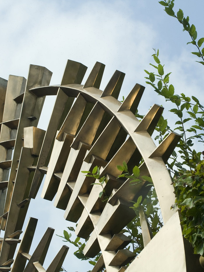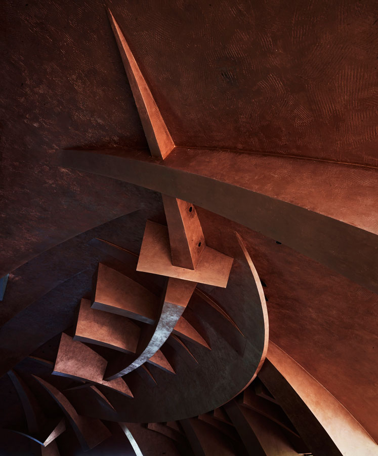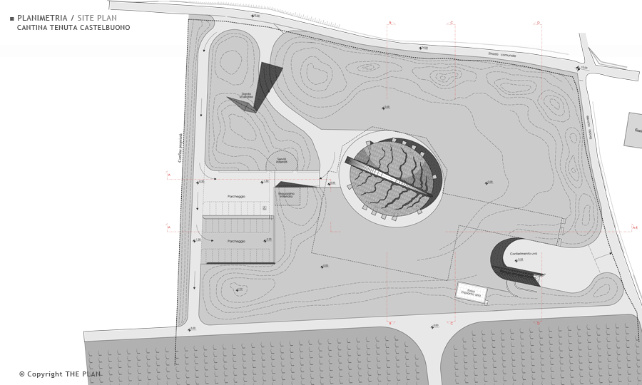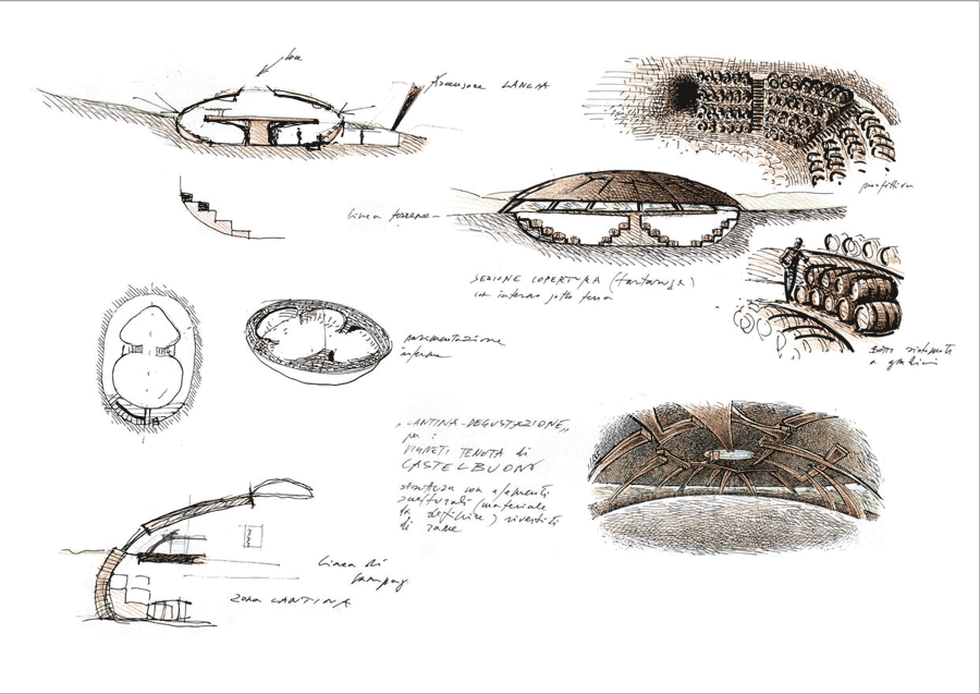 Famiglia Lunelli, Tenuta Castelbuono, comune di Bevagna, Umbria. Arnaldo Pomodoro ha ideato e in collaborazione con lo studio Pedrotti realizzato il progetto conosciuto dai più come il “Carapace”. Un esempio di “architettura scultorea ”che prende spunto dal carapace delle tartarughe per trasmettere concetti quali tempo, naturalità, artificialità e forti collegamenti con la natura, la collina. Una pianta ellittica e il costolone longitudinale, che sostiene con 12 semiarchi laterali la volta, che accoglie i visitatori, mentre attraverso una scala a spirale si raggiunge il piano interrato dove sono presenti barricaia e sala degustazioni. La copertura di rame, le dimensioni dell’edificio e queste forme uniche, rendono questa architettura una “scultura visitabile” entro la quale poter entrare e godere della sua bellezza.