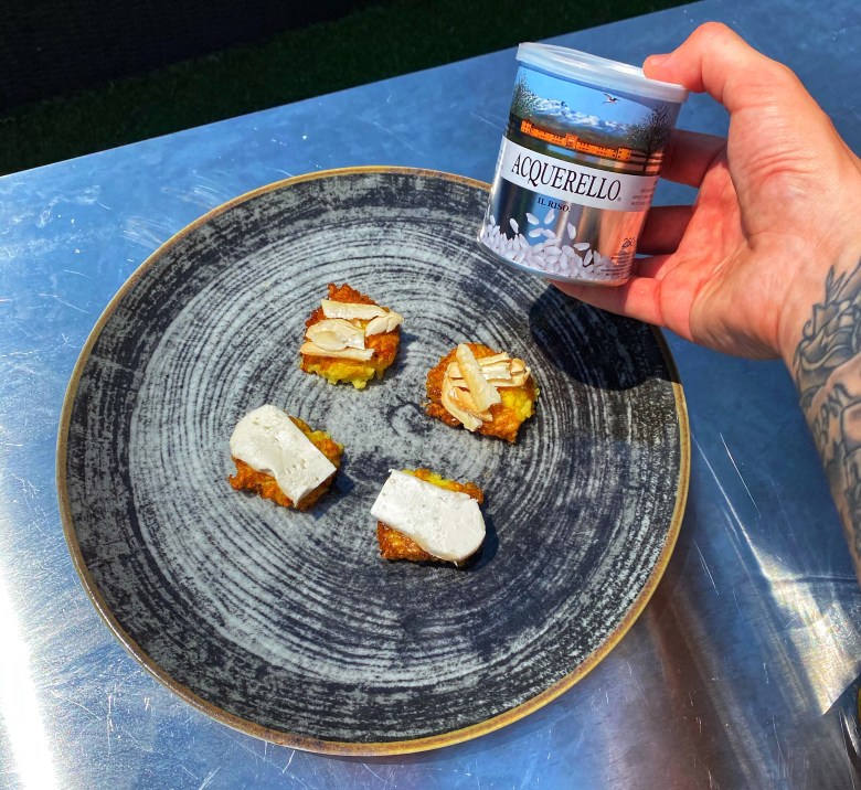 Dopo aver tagliato delle fette di Robiola, una fresca e una stagionata, adagiatela sopra i vostri bites di Riso al Salto e posizionateli dentro un piatto piano. Lasciatevi conquistare da questo formaggio di Capra delle alte valli di langa e sentite il riso sciogliersi dopo aver dato un morso a quella costricina croccante.