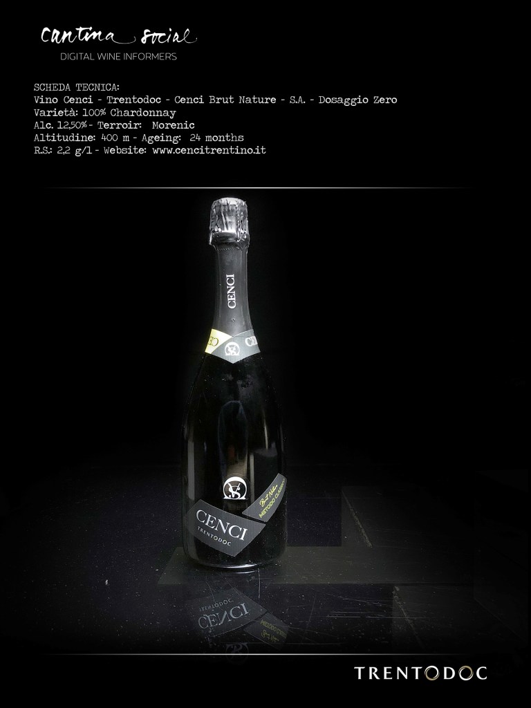 Oggi abbiamo degustato Cenci Brut Nature, Trentodoc che esprime al meglio la sua composizione 100% Chardonnay e che nasce da vigneti coltivati fino a 400 metri di altitudine su terreno morenico. Queste bollicine di montagna sviluppano profumi complessi ed intensi grazie alle giornate calde e alle notti fresche tipiche della Valsugana. 24 mesi di permanenza sui lieviti, si presenta armonico ed equilibrato, con un perlage fine e persistente.
