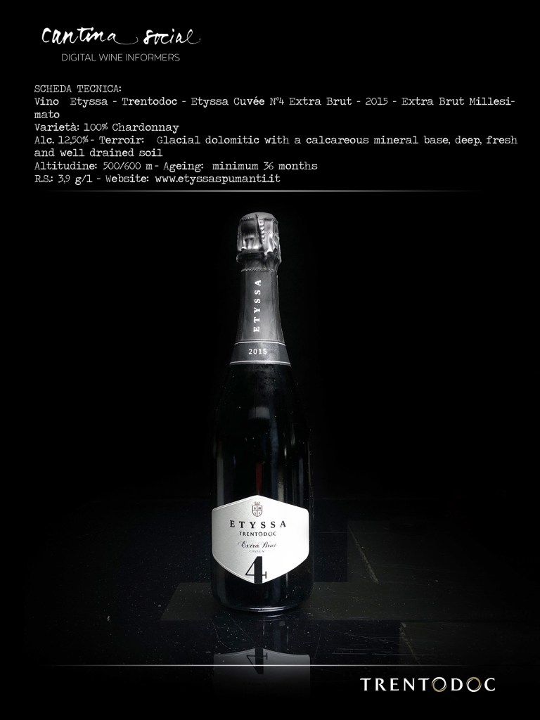 Oggi abbiamo degustato Trentodoc Etyssa Cuvée nr. 4. È un Extra Brut millesimato, 36 mesi di permanenza sui lieviti e 7 mesi di affinamento in legno. Chardonnay in purezza, coltivato a 500 m s.l.m., sulle pendici del Monte Calisio, tra le località di Moià, Tavernaro e Villamontagna.