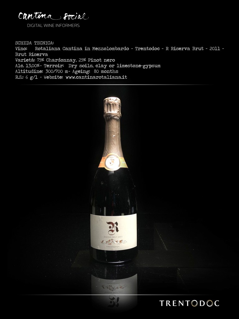 Oggi noi abbiamo degustato una delle due etichette prodotte: Trentodoc R Riserva Brut, ottenuto dal matrimonio tra uve Chardonnay e Pinot nero, che, come abbiamo ormai imparato, conferiscono rispettivamente sentori fruttati e floreali e struttura. I vigneti sono allevati a Guyot e pergola trentina, tra i 300 e i 700 metri di altitudine. La vinificazione è in bianco, con pressatura soffice delle uve e fermentazione dei mosti sia in acciaio che in barrique. 80 i mesi di permanenza sui lieviti.