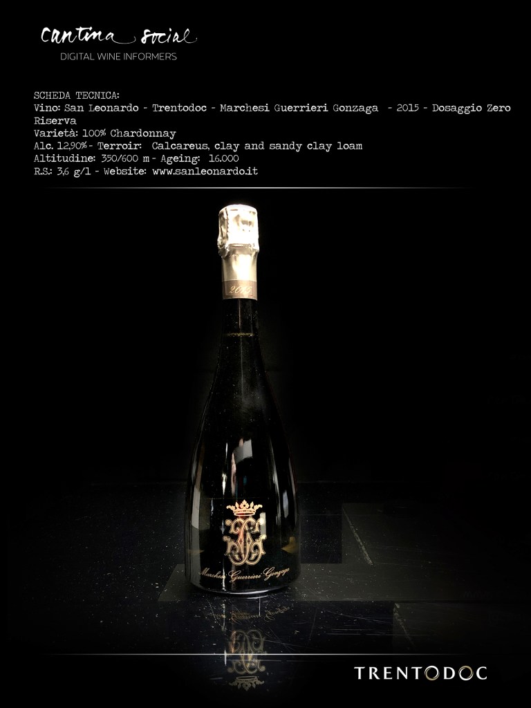 Trentodoc Marchesi Guerrieri Gonzaga è un Blanc de Blancs Dosaggio Zero. 100% Chardonnay, i cui vigneti sono coltivati tra le colline di Pressano ad una quota di 400 metri, su terreni di tipo marnoso calcarei, che regalano vini strutturati, e l’alta val di Cembra tra i 400 e i 700 metri di quota, su terreni sabbiosi di origine porfirica, dove nascono vini più floreali, con una spiccata acidità ed una grande freschezza.