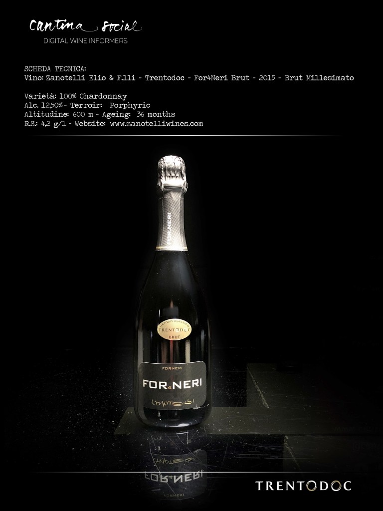 Naturalmente, non può mancare la loro visione del Trentodoc: il loro For4Neri Brut, millesimato con almeno 30 mesi di permanenza sui lieviti, si presenta color giallo paglierino brillante, con perlage fine e persistente. Profumo elegante con note fruttate di mela golden. Gusto molto secco, fresco e strutturato, nel finale ha buona persistenza.